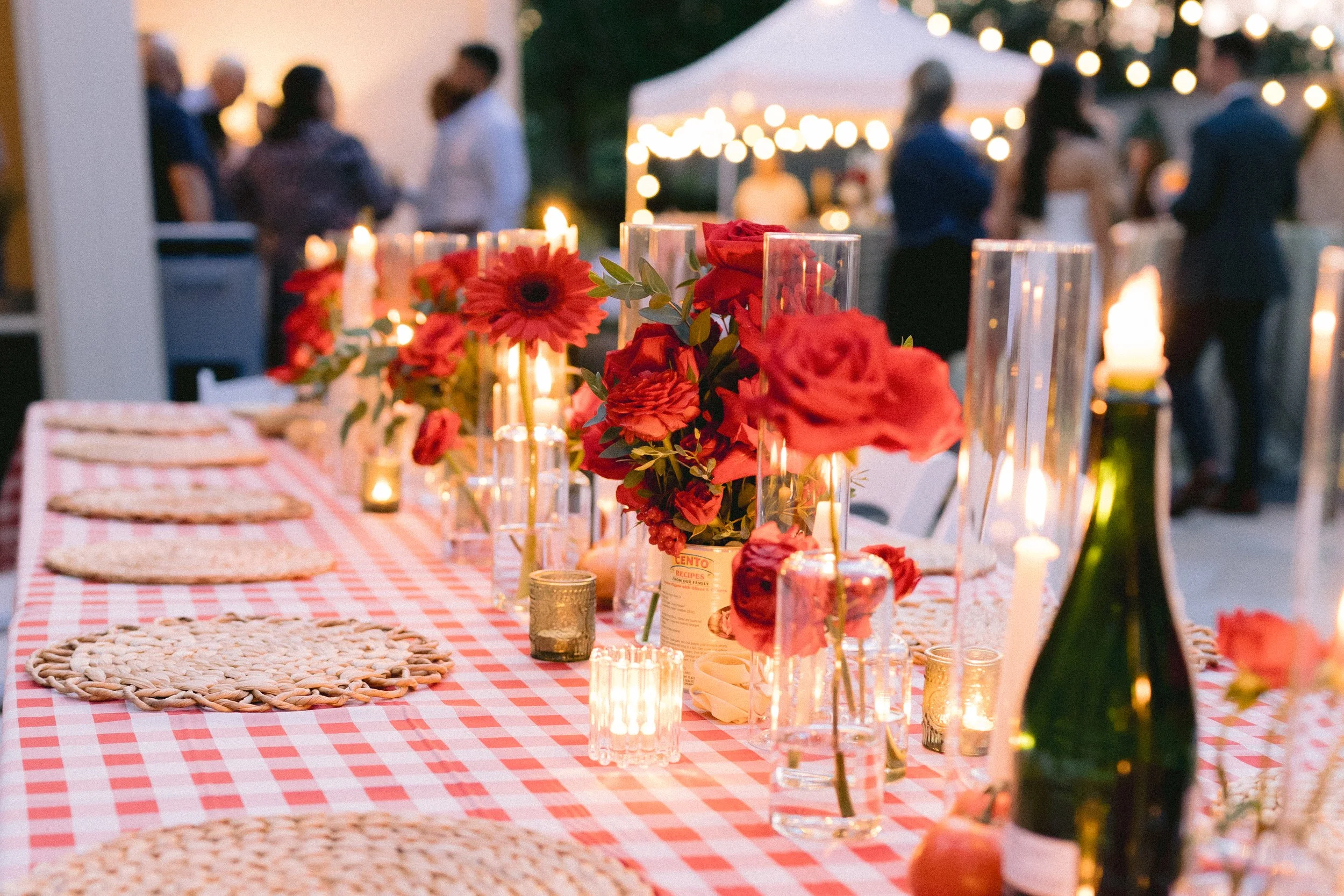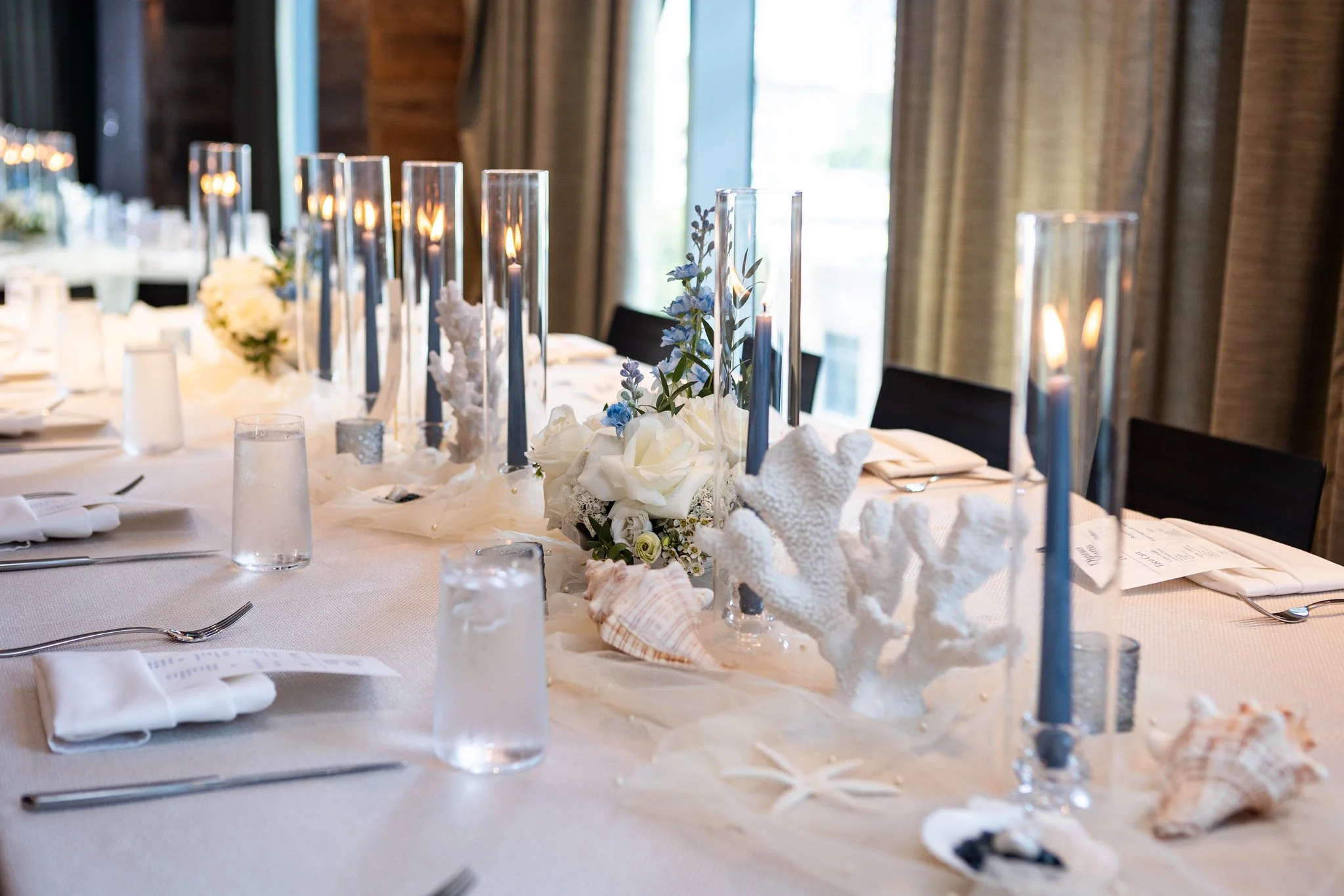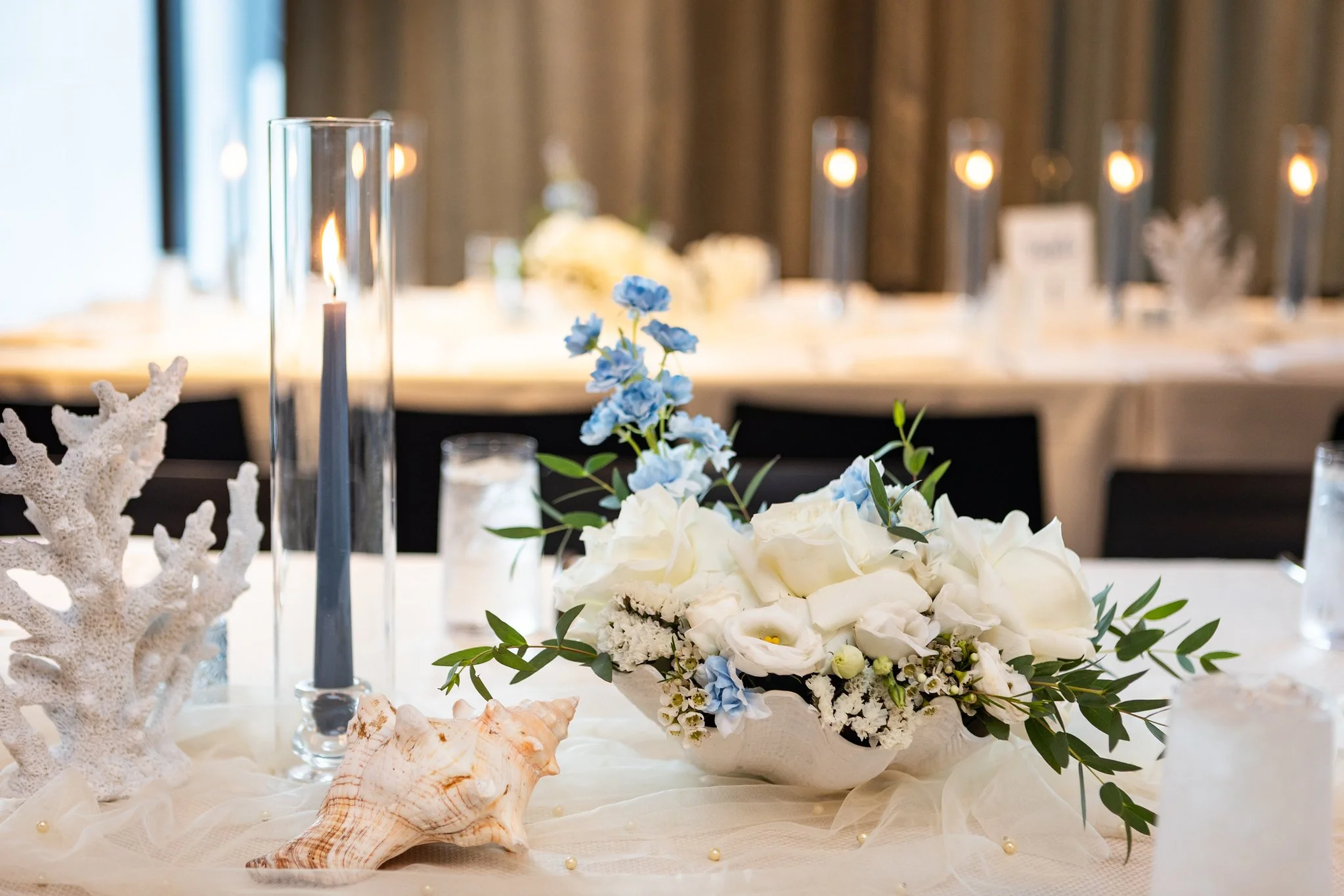 A elegantly decorated table with a white tablecloth, placed with white plates, silverware, and cloth napkins. The centerpiece is a large floral arrangement with white hydrangeas, yellow calla lilies, and lemons. There are multiple blue glassware and lit candles, including tall tapers, creating a cozy ambiance. A large abstract painting hangs on the wall in the background.
